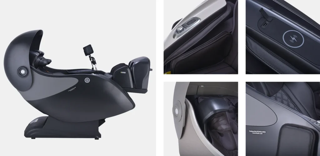 Komfort potęgują: ogrzewanie lędźwi i łydek, pozycja Zero Gravity, głośniki Bluetooth oraz funkcja sterowania głosowego. Fotel wyposażono w nowoczesny tablet z intuicyjnym menu w języku polskim oraz moduł diagnostyczny, który mierzy puls, mikrokrążenie, saturację i poziom zmęczenia, pomagając dobrać idealny program masażu.