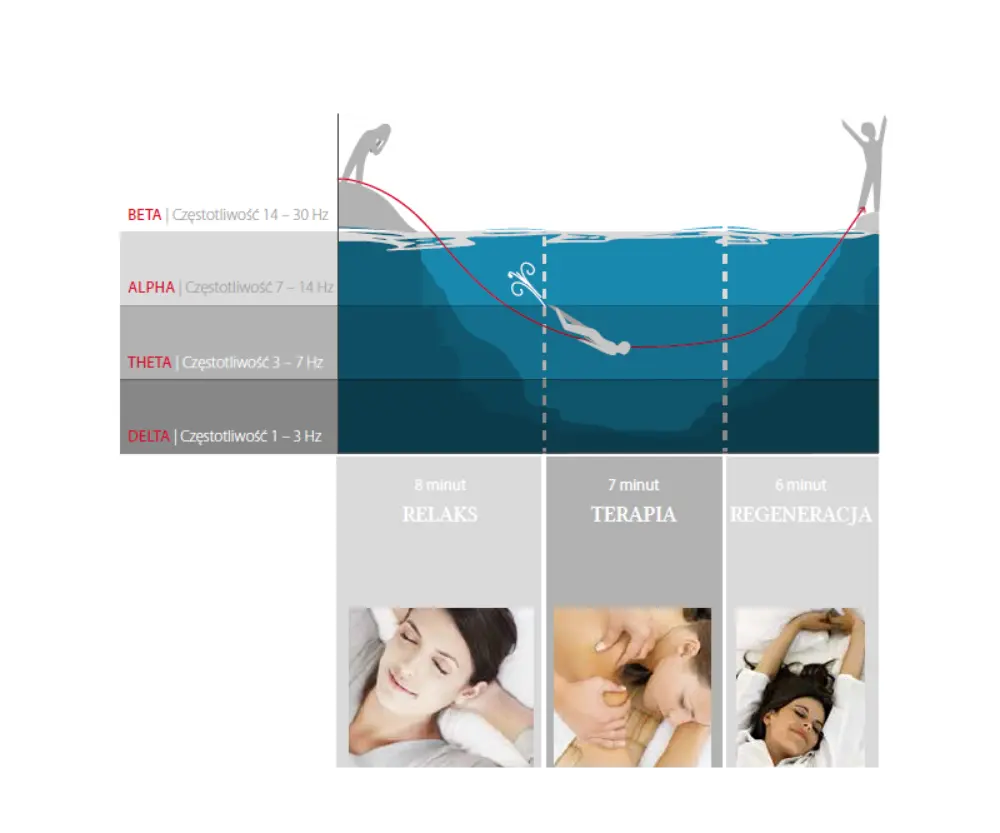 Masaż i muzyka ustają, a w słuchawkach pojawia się szum (dudnienia różnicowe), które stymulują fale mózgowe odpowiedzialne za relaks.
